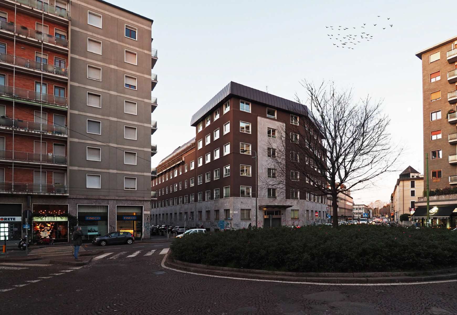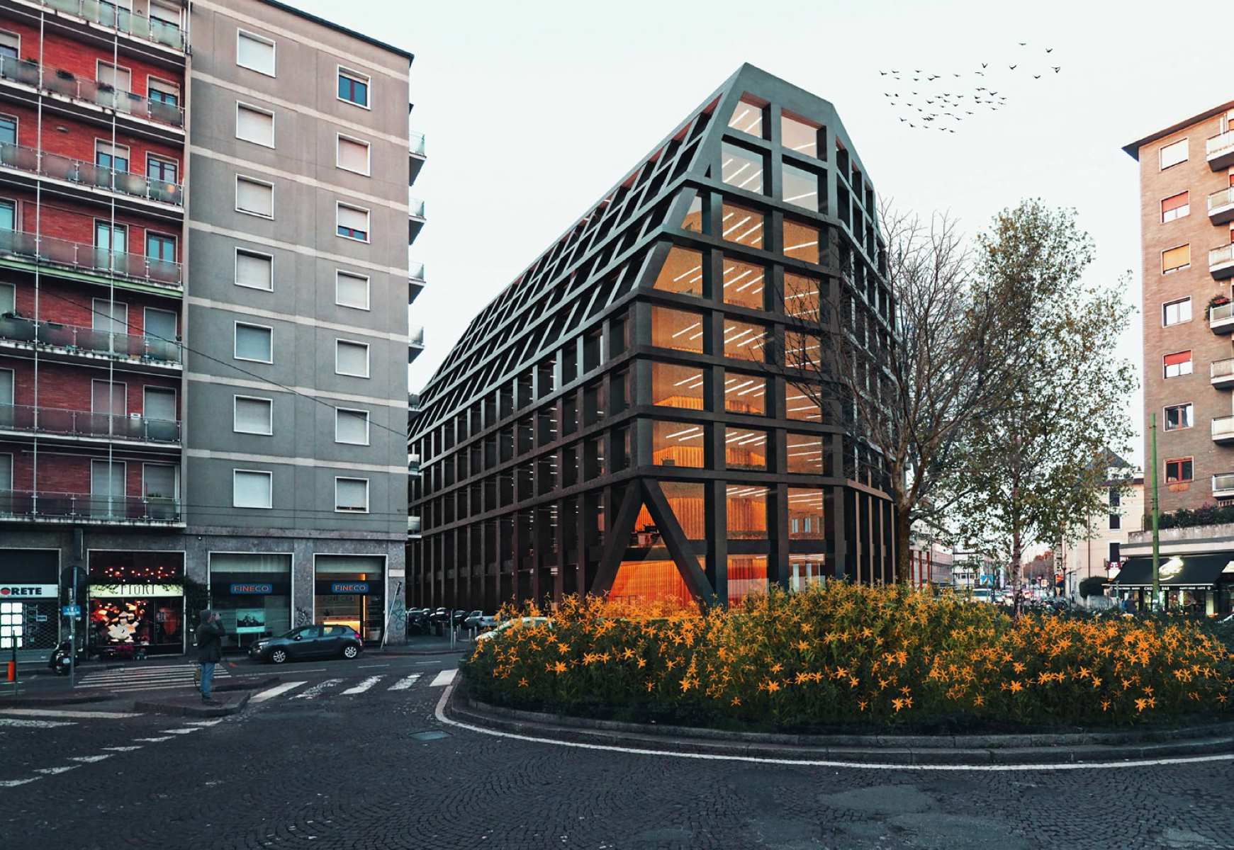 La volontà del progetto di recupero è quella di mantenere la struttura portante dell’edificio, enfatizzata matericamente e risaltata dalla contrapposizione con la facciata vetrata che va così a costituire il modulo di facciata. Un modulo trasparente, leggero che permetta di poter scrutare in maniera discreta all’interno dell’edificio e allo stesso tempo lasci la possibilità a coloro che occupano gli spazi uffici di poter godere di una vista importante sulla nuova Milano, da un lato Porta Nuova e dall’atro City Life. A partire dal quinto livello, il fronte su via Cola Montano abbandona l’ortogonalità rispetto alla strada e subisce un’inclinazione che attribuisce un carattere distintivo all’edificio. Anche le testate su via Ugo Bassi e via Cola Montano presentano porzioni di facciata inclinate così da conferire all’edificio una geometria prismatica, caratterizzata da diverse sfaccettature.